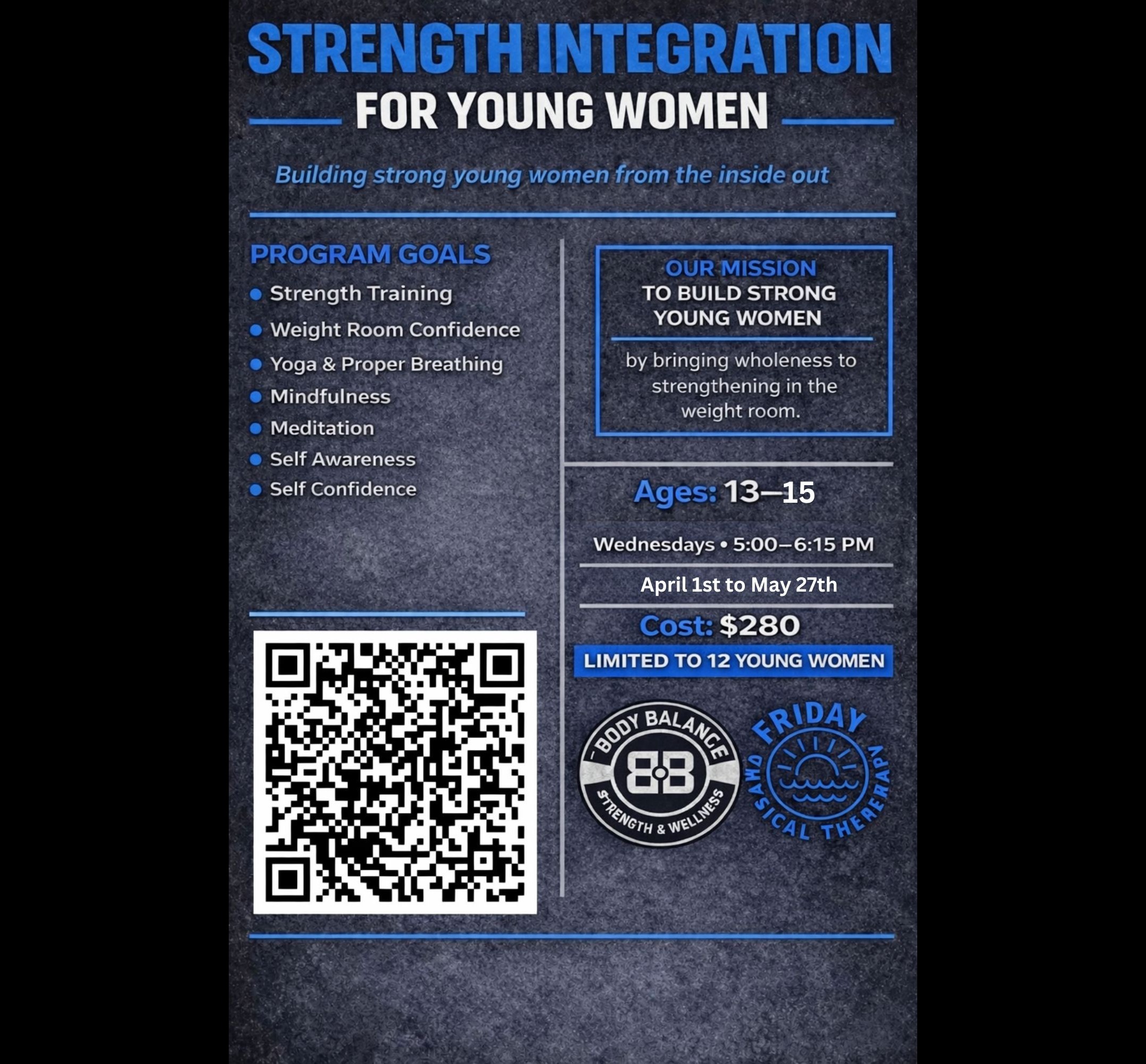 Come join Silvana Busch and Allyson Friday as they coach the girls through strength training workouts, yoga, and breath work, meditation and mindfulness. In addition to confidence building both in the weight room and beyond. limited to 12 girls. Ages 13-17.